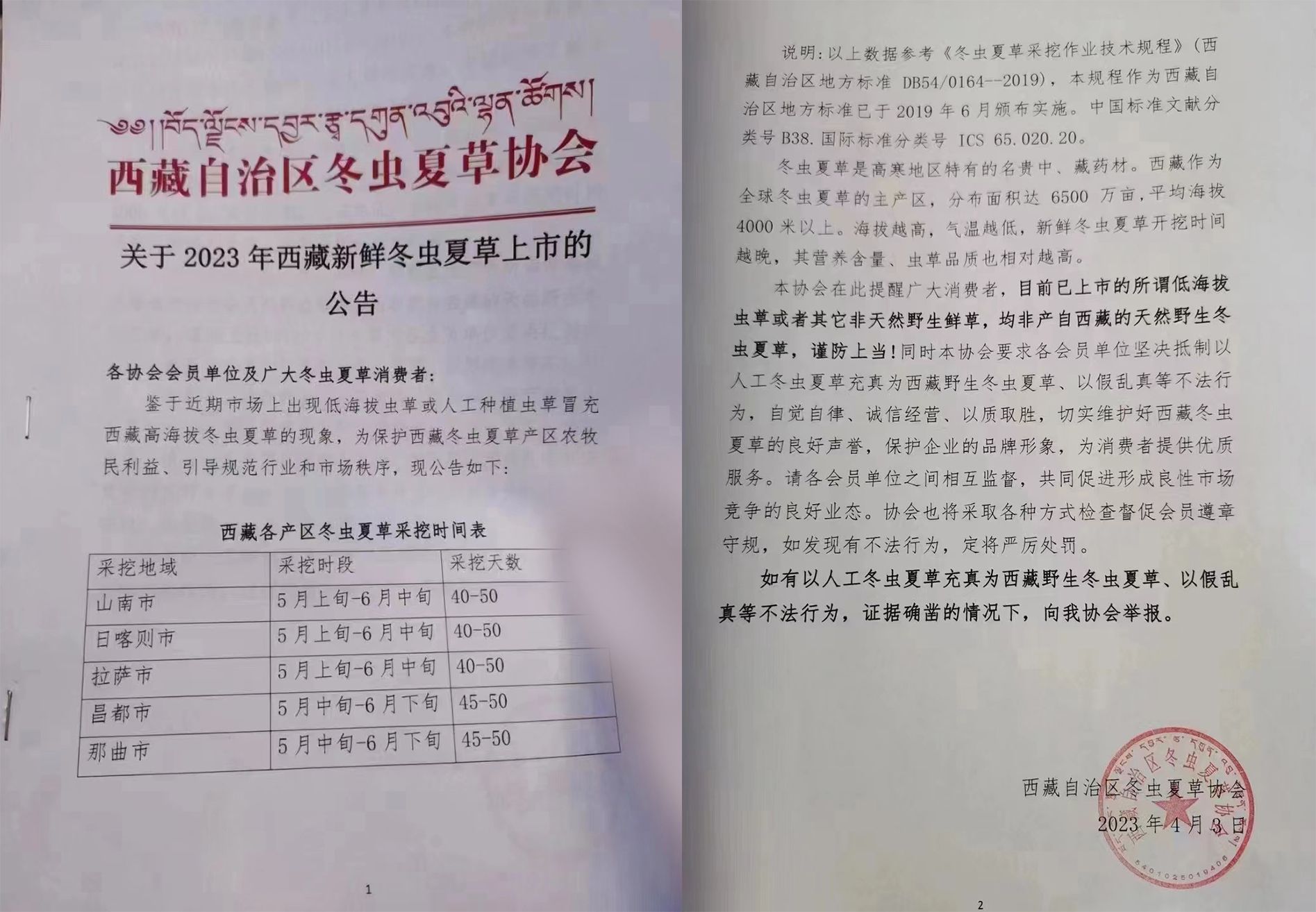 鑒于近期市場(chǎng)上出現(xiàn)低海拔蟲草或人工種植蟲草冒充西藏高海拔冬蟲夏草的現(xiàn)象,為保護(hù)西藏冬蟲夏草產(chǎn)區(qū)農(nóng)牧民利益、引導(dǎo)規(guī)范行業(yè)和市場(chǎng)秩序,現(xiàn)公告如下: